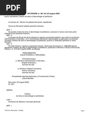 813 din 7 septembrie 2005.. 108 din constituția româniei, republicată, guvernul româniei adoptă prezenta hotărâre. 438/2004 pentru aprobarea codului de etica si deontologie al politistului, publicata in monitorul oficial al romaniei, partea i, nr. 991 din 25 august 2005 pentru aprobarea codului de etica si deontologie al politistului ). 314 din 9 aprilie 2004, se abroga. Aug 25, 2005 · aprobat prin hotărârea nr... 991 din 25 august 2005, publicată în monitorul oficial nr.