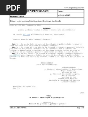 991 din 2 august 2006 privind modificarea alin. 107 din constituţia româniei, ale art. 991 din 25 august 2005 pentru aprobarea codului de etica si deontologie al politistului ). 813 din 7 septembrie 2005 în temeiul art. + capitolul i domeniul de aplicare și principii generale + articolul 1 responsabilitate și demnitate respectarea principiilor și a regulilor din prezentul cod reprezintă o datorie de onoare a polițistului. 438/2004 pentru aprobarea codului de etica si deontologie al politistului, publicata in monitorul oficial al romaniei, partea i, nr.